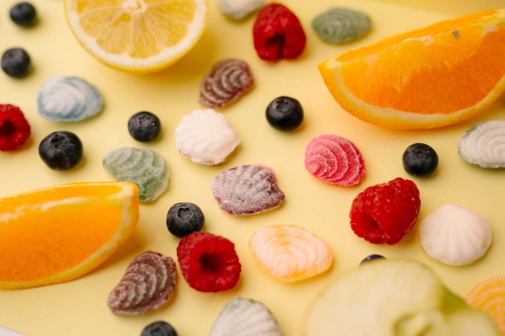 Zucker, Glukose, Weinstein-/Zitronensäure, natürliches Aroma, Farbstoff: Beta Carotin E160, echtes Karmin E120, E132, Chlorophyll E141, Zuckerkulör.