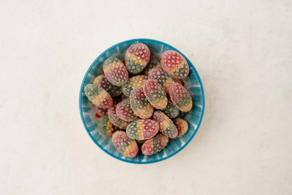 Zucker, Glukose, Weinsteinsäure, natürliches Aroma, Farbstoff: Chlorophyll E141, echtes Karmin E120, Zuckerkulör.